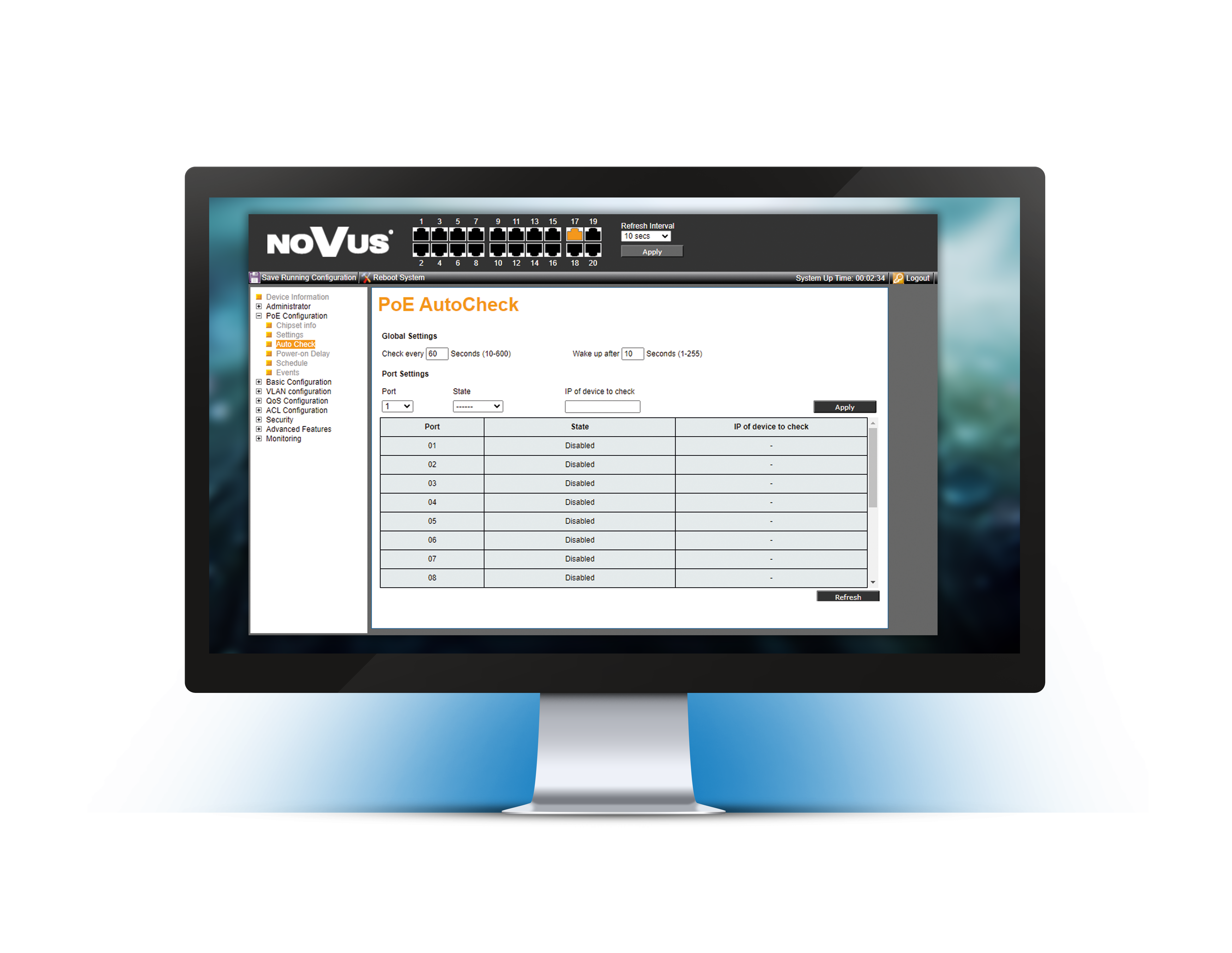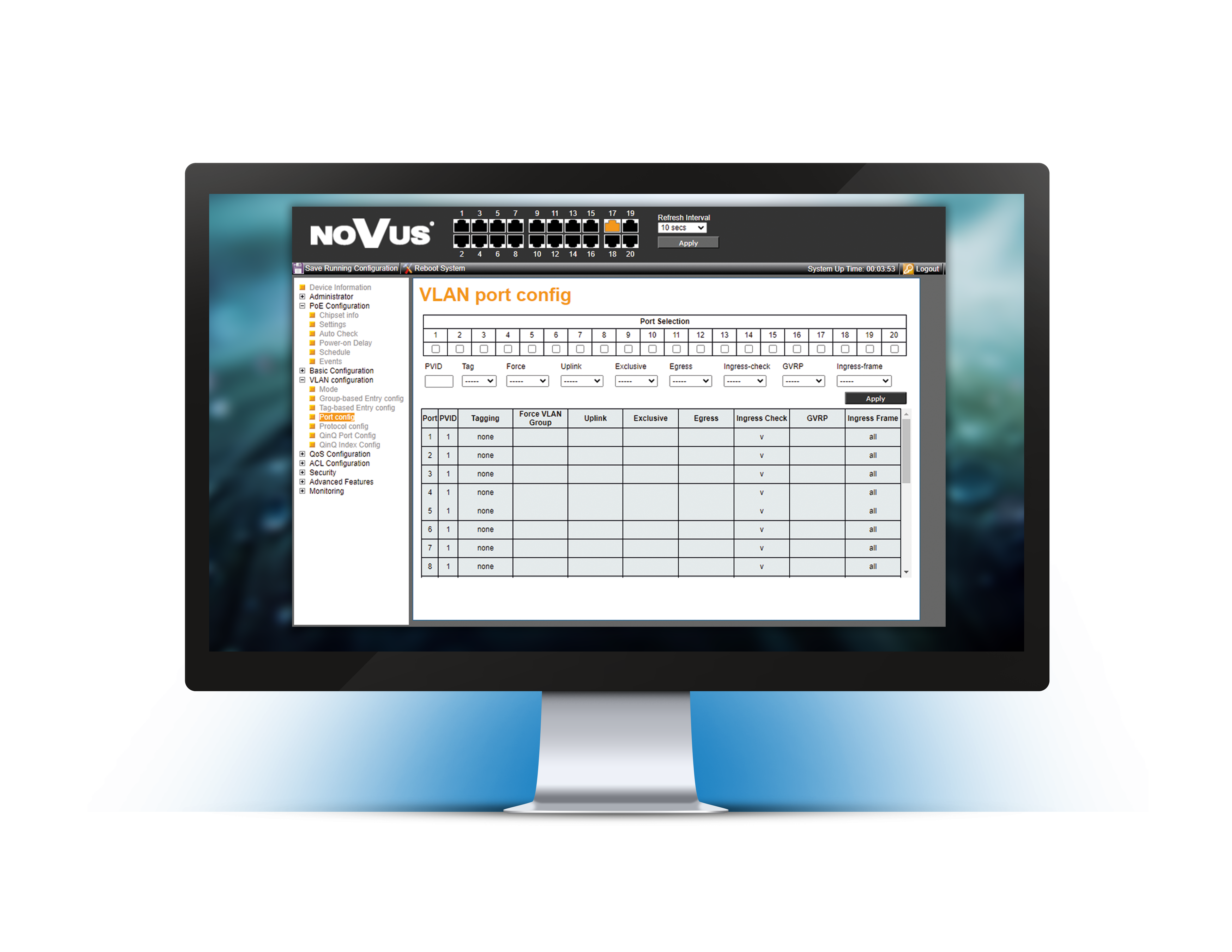 It allows for remote configuration from the web interface: PoE ports, virtual VLANs, connection redundancy (Link Aggregation), bandwidth limit and many more.