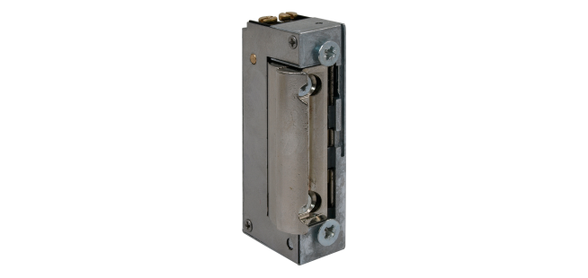 Electric strike (NC), low-current, narrow, for remote wired opening of doors, gates, flaps, furniture. It can be used in steel, aluminum, wooden and PVC profiles, both internal and external, with the possibility of assembly for left and right doors as well as vertical and horizontal. Adjusting the hook in the range of 3mm facilitates assembly and ensures precise adjustment of the electric strike to the handle lock.