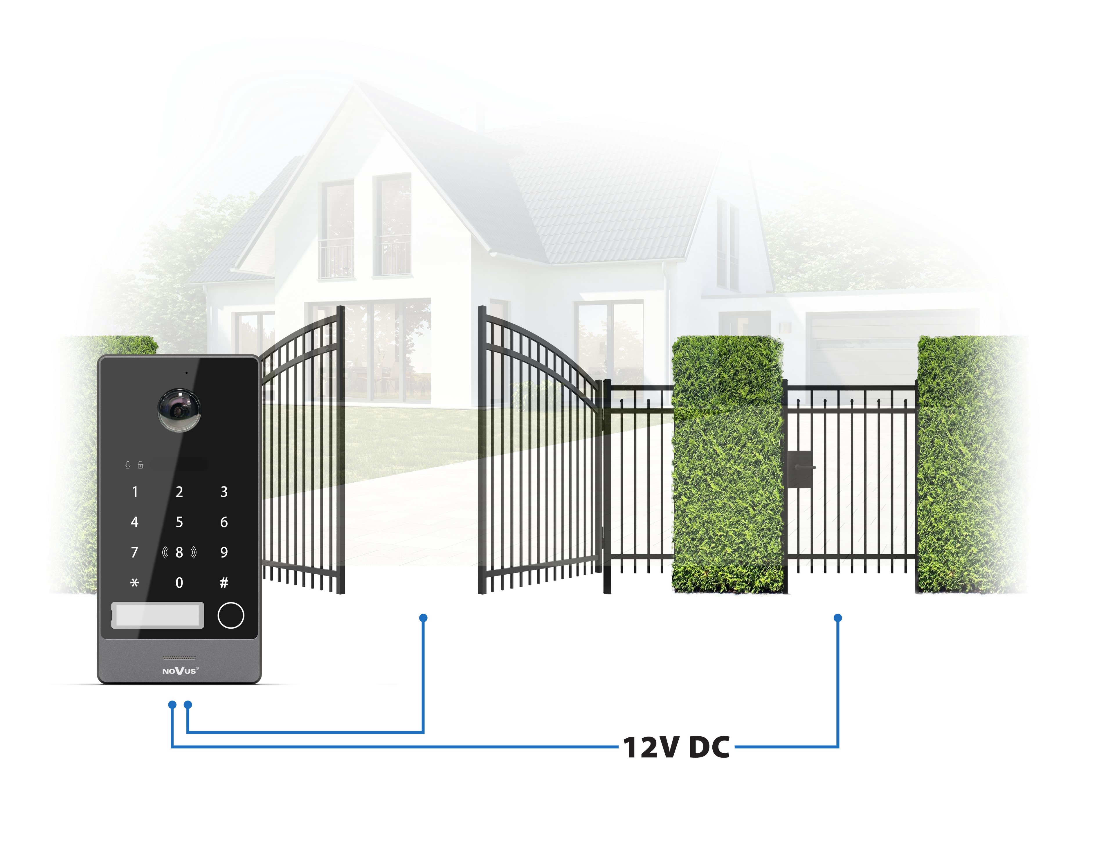 The gate and door can be opened using proximity cards thanks to the built-in Mifare 13.56 MHz reader. Up to 1000 user cards can be used. The keypad allows the gate and door to be opened using a user code.