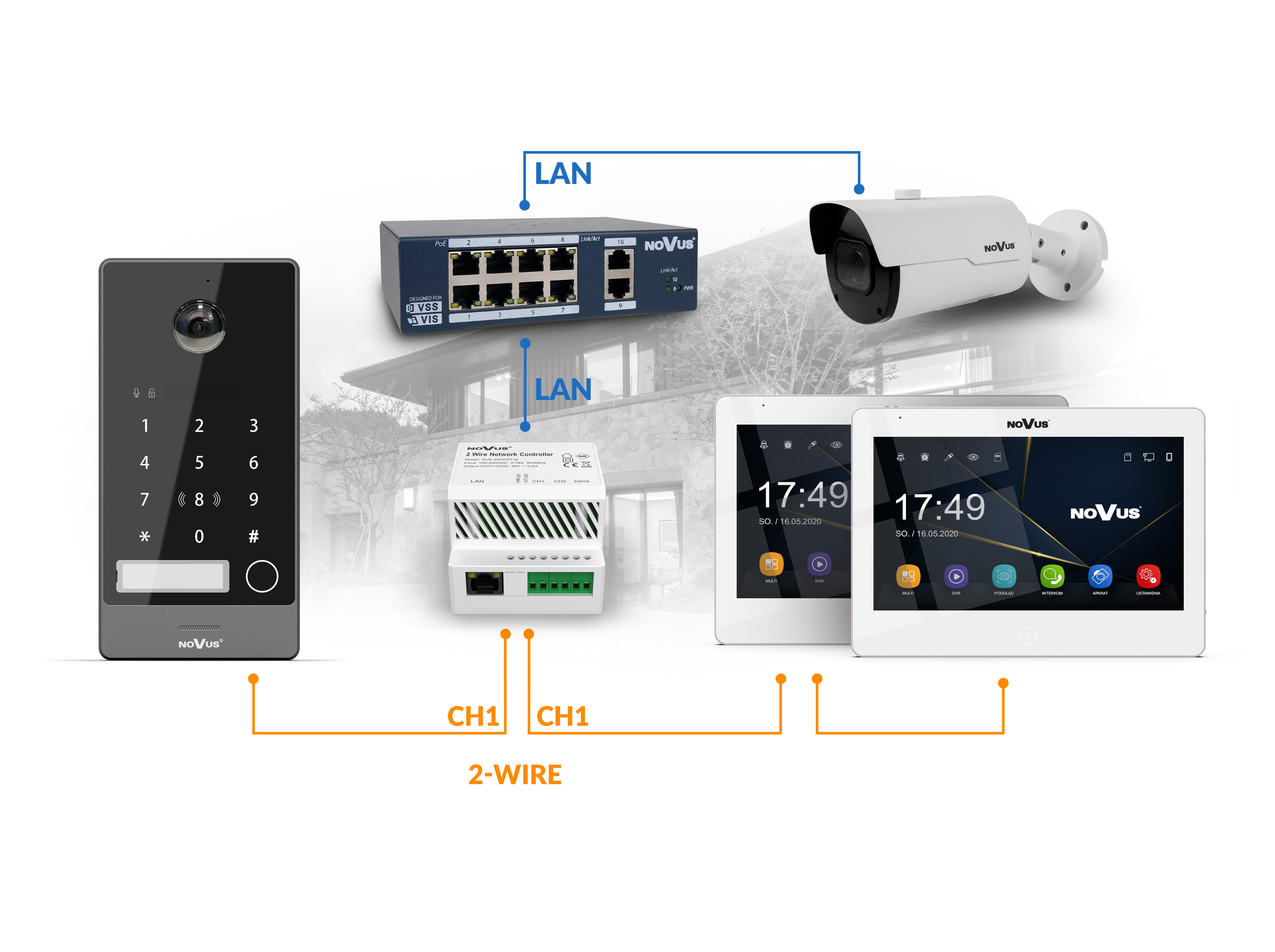 2-WIRE IP technology allows data transmission and power supply using two wires. The 2-WIRE IP bus enables two-way communication without polarity. It does not require the use of UTP cables, which allows for easy and economical modernization of the existing system. By utilizing the existing cable infrastructure, it allows you to take advantage of the benefits and functionality of IP technology.