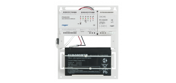 Zestaw złożony z kontrolera dostępu PR402DR oraz transformatora sieciowego PS-10ACDR (18VA) osadzonych fabrycznie w obudowie metalowej z miejscem na akumulator awaryjny 7Ah/12V.