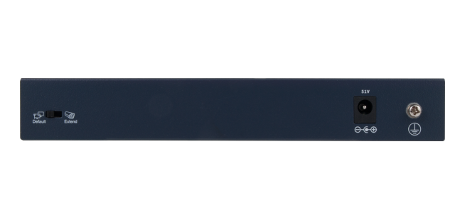 Przełącznik trybu extended, zwiększający zasięg transmisji i zasilania PoE od 150 do 250m (Przy transmisji pasmem 10 Mb/s)