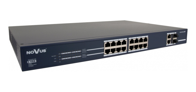 Porty zewnętrzne | Porty PoE+: 16 x 10/100Mb/s (ilość dostępnych równocześnie portów w trybie PoE+ ograniczona wydajnością zasilacza), Uplink Combo x 2 :SFP(1Gb/s) + RJ45(1Gb/s) |