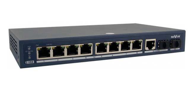 | Porty zewnętrzne | Porty PoE+: 8 x 10/100Mb/s (ilość dostępnych równocześnie portów w trybie PoE+ ograniczona wydajnością zasilacza), Porty optyczne UPLINK: 1 x SFP, Uplink Combo x 1 :SFP(1Gb/s) + RJ45(1Gb/s) |