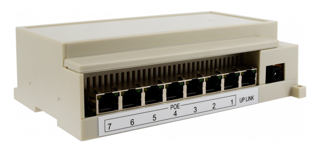 Przełącznik NVE-SW200-7P to urządzenie przeznaczone do skomunikowania pozostałych urządzeń systemu NVE, czyli paneli wejściowych z monitorami. Siedem portów pozwala na podłączenie i zasilenie za pomocą sPoE (18VDC) grupy urządzeń a dodatkowy port UP-LINK w razie potrzeby pozwala na podłączenie kolejnego przełącznika.