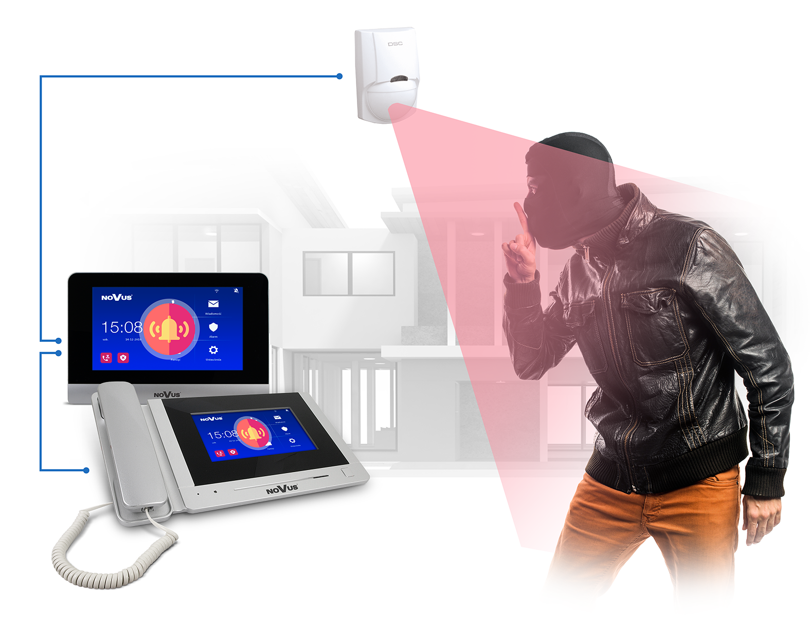 Monitor abonencki umożliwia stworzenie prostego systemu alarmowego opartego o 8 wejść NO/NC oraz 1 wyjście alarmowe. Linie alarmowe posiadają do dyspozycji 3 typy wyzwalania: natychmiastowy, z opóźnieniem oraz natychmiastowy 24h. Alarm sygnalizowany jest również na monitorze ochrony NVE-GM200.