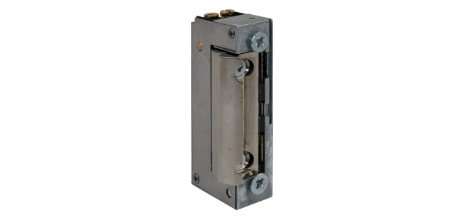 Elektrozaczep (NC), niskoprądowy, wąski, do zdalnego przewodowego otwierania drzwi, furtek, klap, mebli. Może być stosowany w profilach stalowych, aluminiowych, drewnianych oraz PCV, zarówno wewnętrznych jak i zewnętrznych z możliwością montażu do drzwi prawych i lewych oraz w pozycji pionowej jak i poziomej. Regulacja zaczepu w zakresie 3mm ułatwia montaż i zapewnia precyzyjne dopasowanie elektrozaczepu do zamka klamkowego.