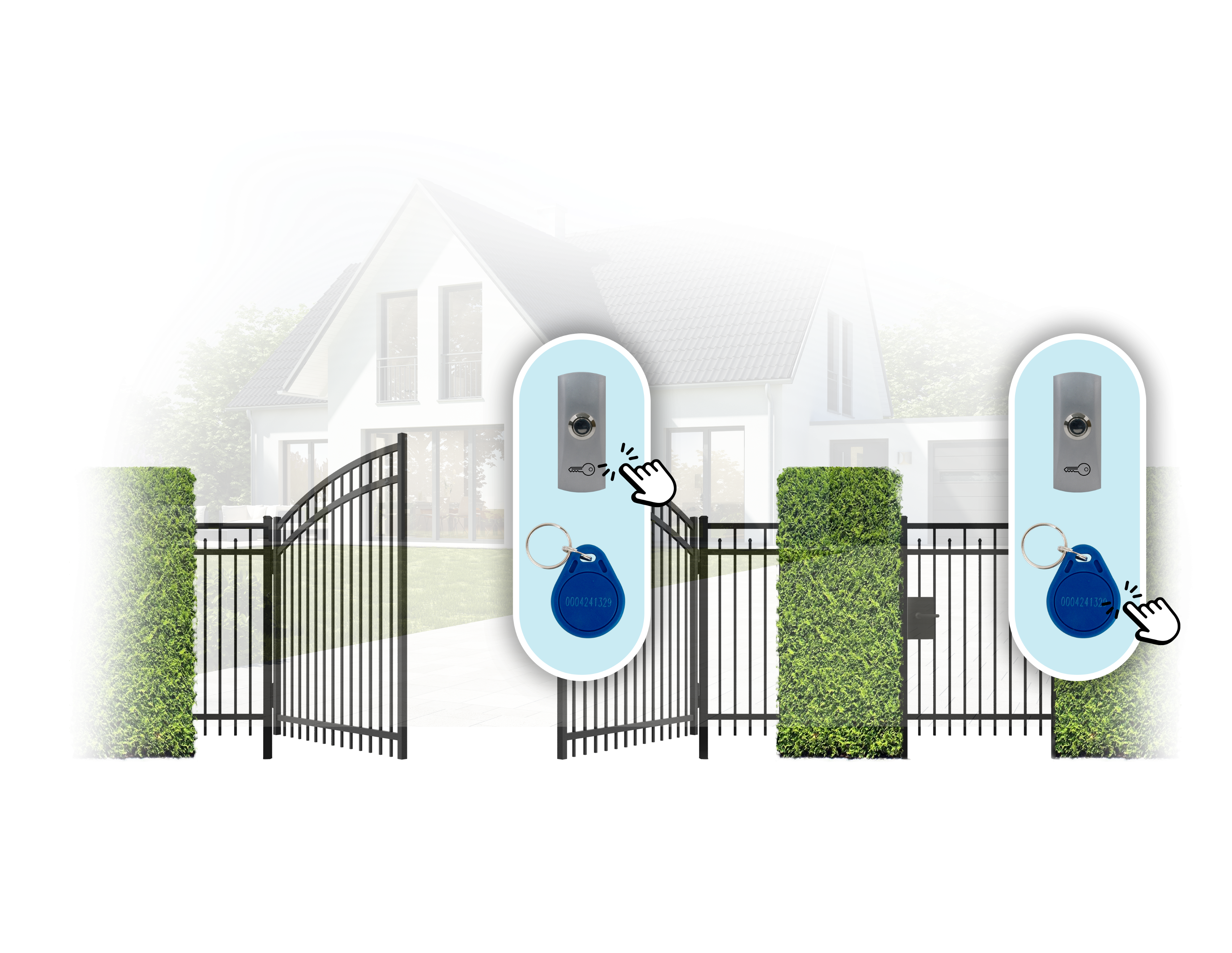 Możliwość otwierania furtki oraz bramy za pomocą kart zbliżeniowych, dzięki wbudowanemu czytnikowi Unique 125 kHz. Możliwość zastosowania do 1000 kart użytkowników. Klawiatura umożliwia otwarcie furtki oraz bramy za pomocą kodu użytkownika.
