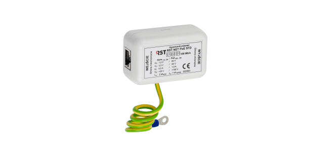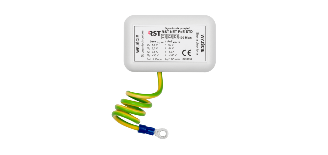 Ogranicznik przepięć do ochrony systemów telewizji dozorowej IP. Kompatybilny z podstawowymi standardami zasilania PoE (zwarte pary 4-5 i 7-8). Zapewnia bezpieczną transmisję do 100 Mb/s. Ochrona dwustopniowa za pomocą odgromników i diod. Obudowa umożliwia uziemienie za pomocą linki.