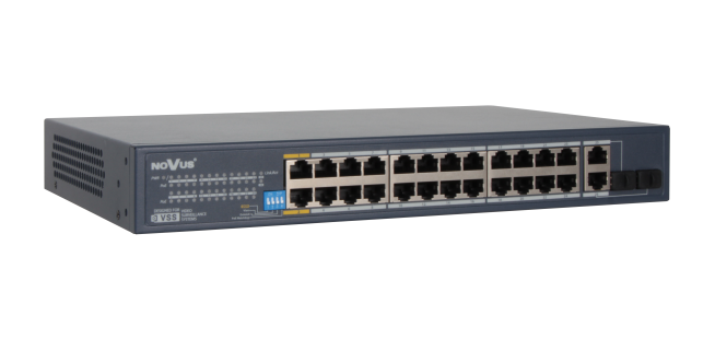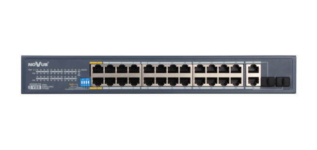 | Porty zewnętrzne | Porty PoE+: 24 x 10/100Mbps (ilość dostępnych równocześnie portów w trybie PoE+ ograniczona wydajnością zasilacza), Uplink Combo x 2 :SFP(1Gb/s) + RJ45(1Gb/s) |